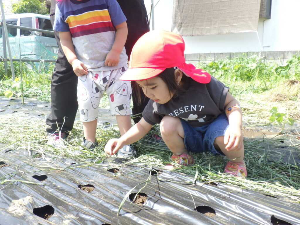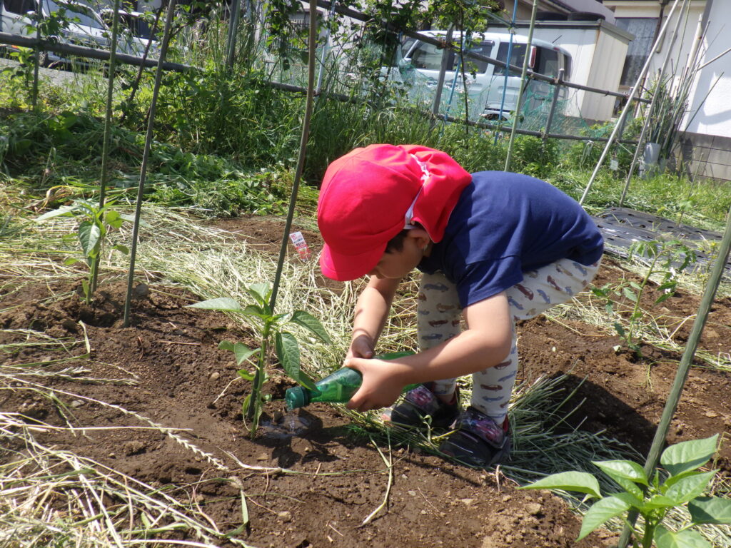 子どもたちが、畑に夏野菜を植えました。キュウリ、トマト、なす、ピーマン、トウモロコシ、スイカ、ズッキーニ、メロン。