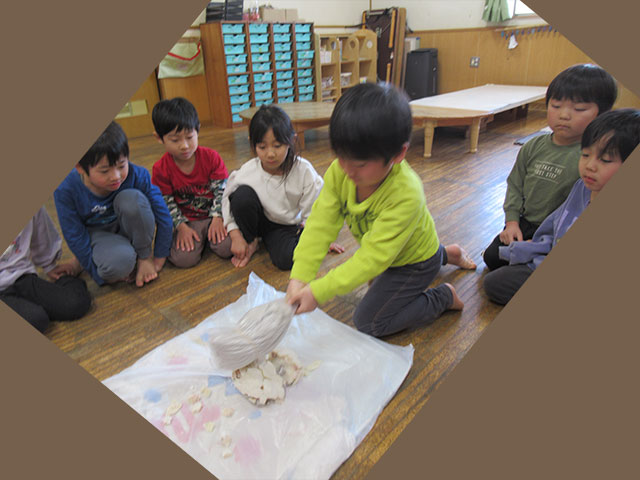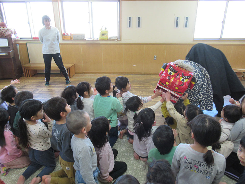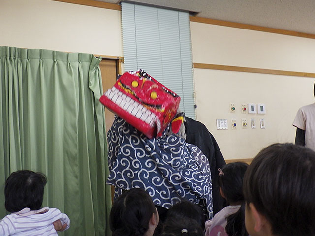 2025年01月10日更新 イベント みんなで鏡開き 今日は鏡開き。 お獅子が登場すると、顔を隠す子、泣きだす子、「ん?なんだ?」と見つめる子。恒例行事で一年のスタートです。お獅子に頭を噛んでもらうと一年元気に過ごせると知っている子もいて、目をつぶって頭を差し出す子も。そして年末に作った鏡餅で鏡開き。一年の健康を願っておやつに御汁粉で食べました。