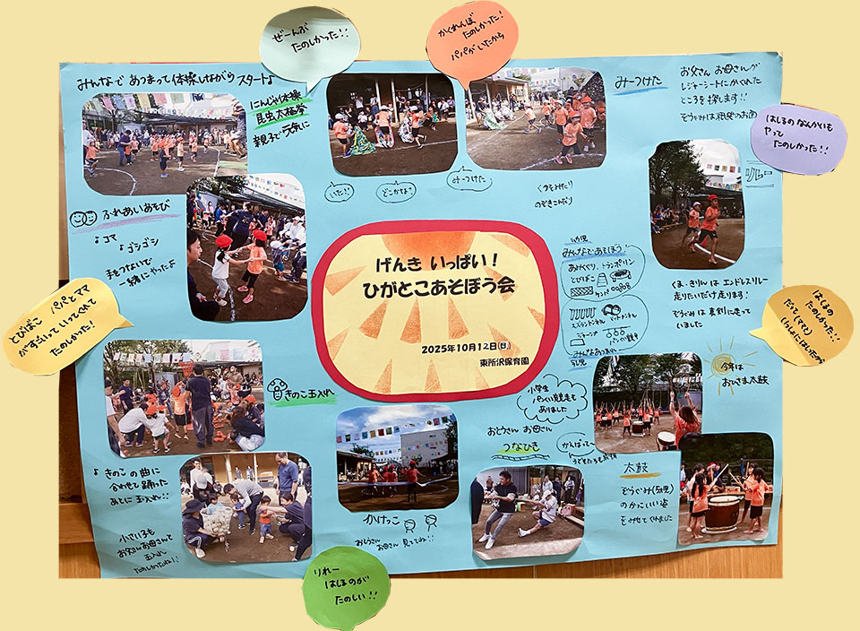 今年度より、運動会ではなく『げんきいっぱいひがとこあそぼう会』に名前を変え、10月12日に開催しました。子どもも大人も笑顔がいっぱいの会にしたい!「こんなのは どう?」「これも楽しそうだな…。」「こうやったらスムーズにいくかな…。」色々な意見を出し合い、時間配分を考え、さてどうなることか…と思いながらの当日。保護者の皆さんのご協力のもと、私たちが思っていた以上にスム ーズに流れ、おまけの競技まで入れることができ、乳児クラスの子どもたちも楽しく参加することのできたあそぼう会になりました。