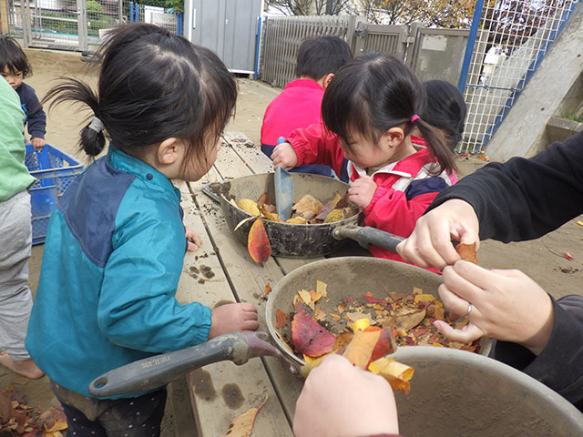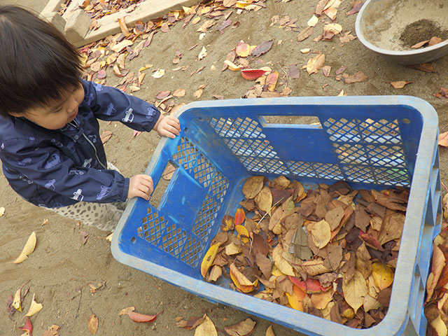 早いもので今年もあと一か月。時間が過ぎるのはほんとに早いものです。10月ころから見事に紅葉した桜の葉がひらひらと舞い落ち、園庭では子どもたちが色とりどりの葉を手に取り、秋の自然を楽しんでいます。子どもたちにとっては遊びにつながる落ち葉も、落ち葉の掃除となるとやってもやっても追いつかない毎日。