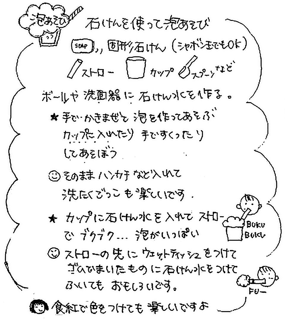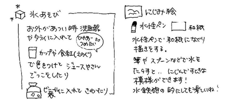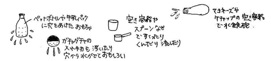 保育園では夏になるといろいろな水あそびをしています。お家でもやってみてくださいね。