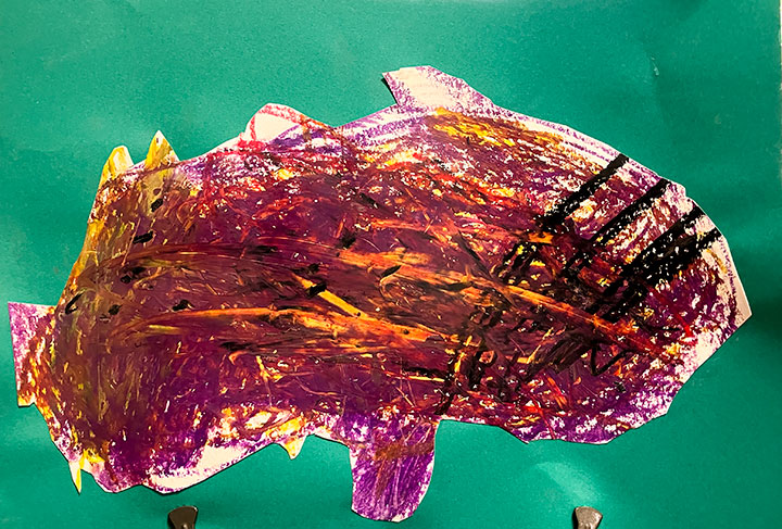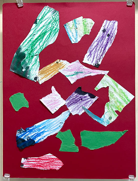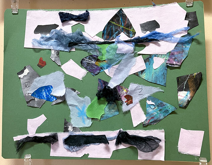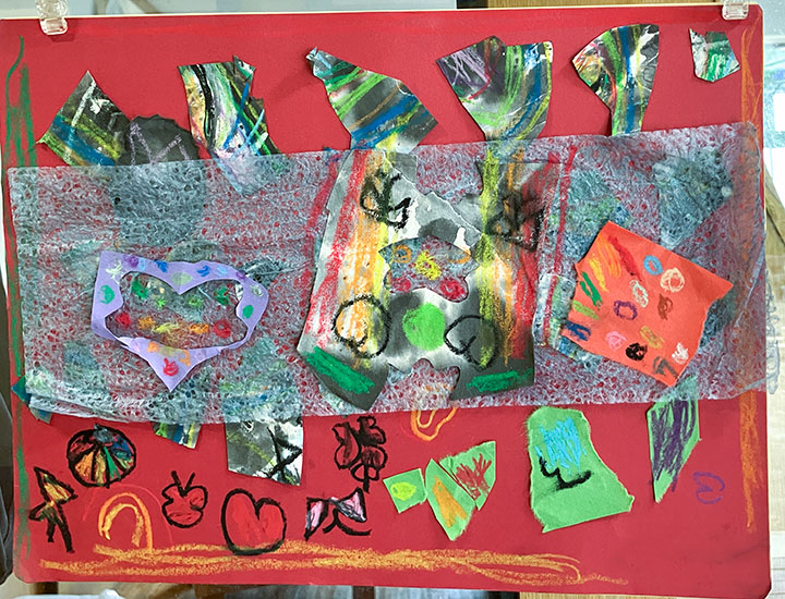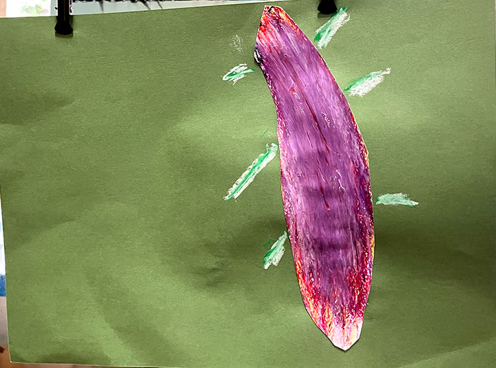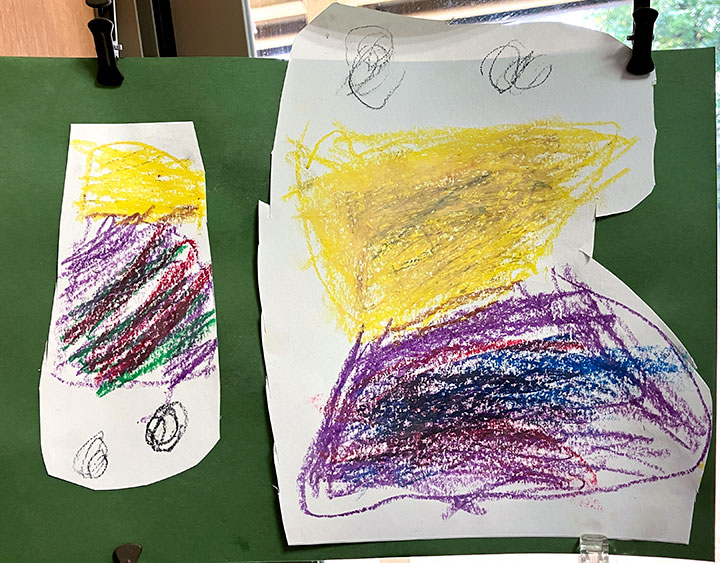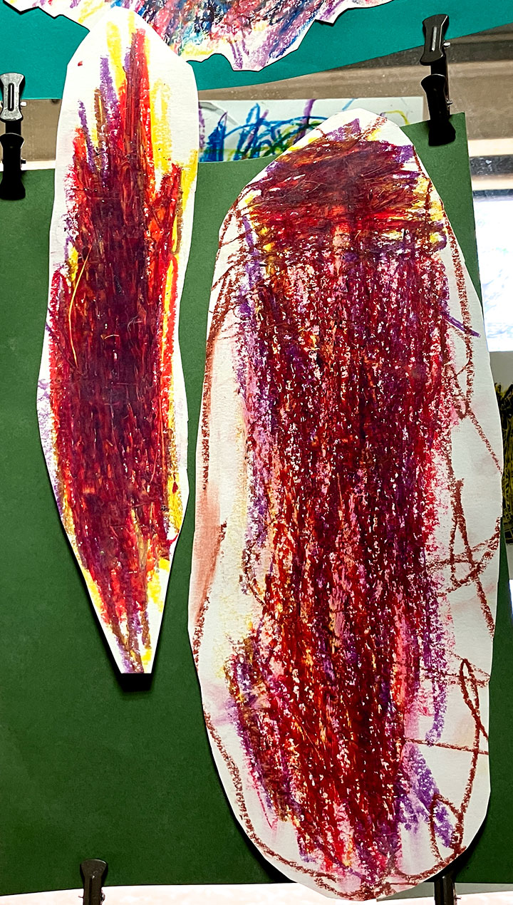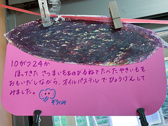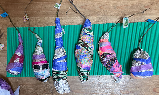 幼児クラスの子どもたちが作ったさつまいものオブジェ。思い思いのさつまいもの形を新聞紙を潰して丸めたものに、アルミホイルで包み固めました。そこに本物のツルを絡めて色とりどりのマスキングテープを巻いて自分だけのさつまいもを作りました。どんな味がするか食べてみたくなるような仕上がりです!