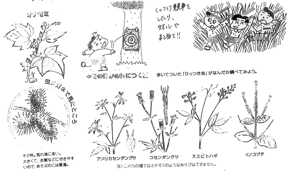 衣服についたこの「ひっつき虫」は一度くっつくと取れないような仕組みになっています。この一見嫌われ者の種もその仕組みを遊びに利用して楽しむことができます。
