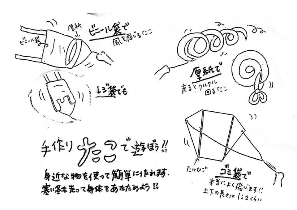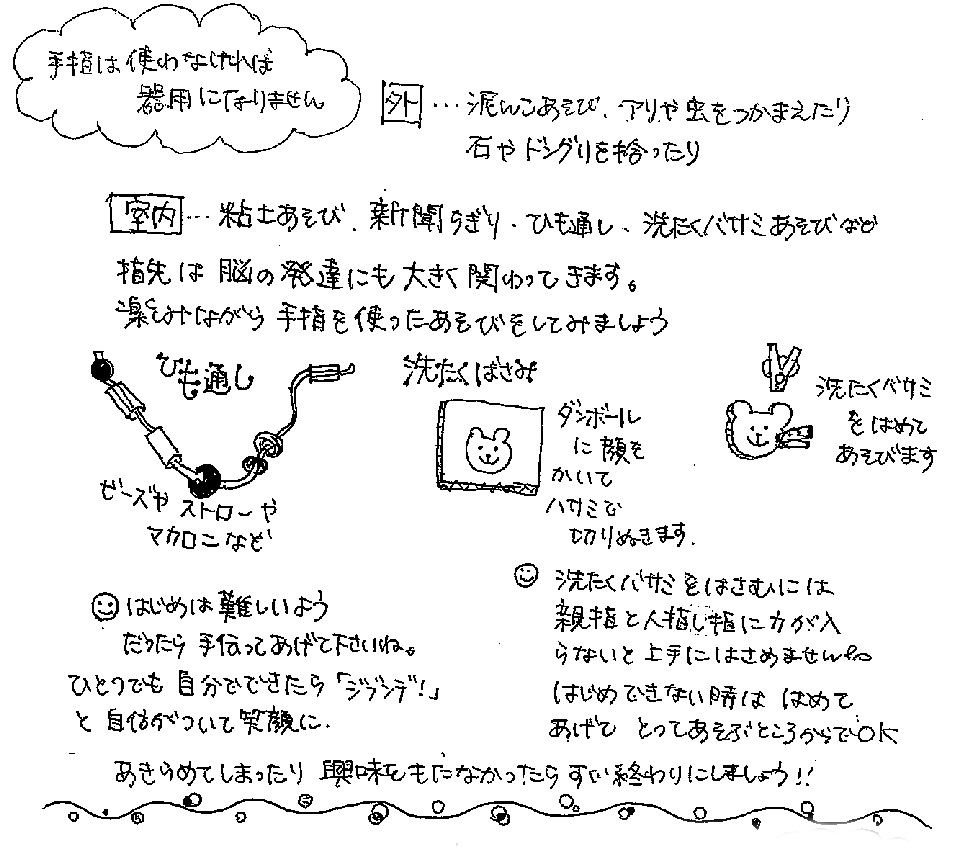 両手を使って何個か同時に操る遊びが多いですが、初めは簡単な片手遊びから挑戦して、手と目を慣らすと良いでしょう。また、高齢者の中には、目を見はるぐらい上手な方がいらっしゃいますから、子ども達に伝承の技を伝えていただけるといいですね。