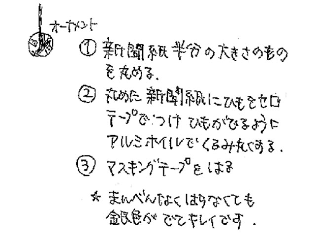 上の④までをそれぞれ色を変えて3個作りイラストのように直角にクロスさせて重なり合った部分をもう1色のテープで巻きます。