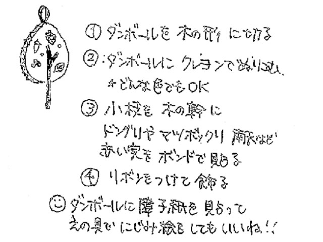 先日、4、5歳のクリスマス会がありました。大好きな絵本「へんしんトンネル」ごっこ、いつもあそんでいる「かごめかごめ」や「ことしのぼたん」のわらべうたあそび、「もうじゅう狩り」のゲーム、歌などお家の方に見に来てもらいました。5歳児の子ども達は自分で作ったろうそくたてにろうそくをたててクリスマスの歌を歌います。1年前ははずかしくて前に出られなかった子も成長し立派な姿を見せてくれました。子ども達の持っている力に驚かされます。