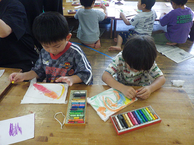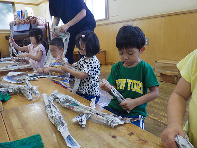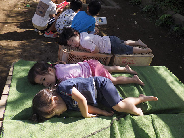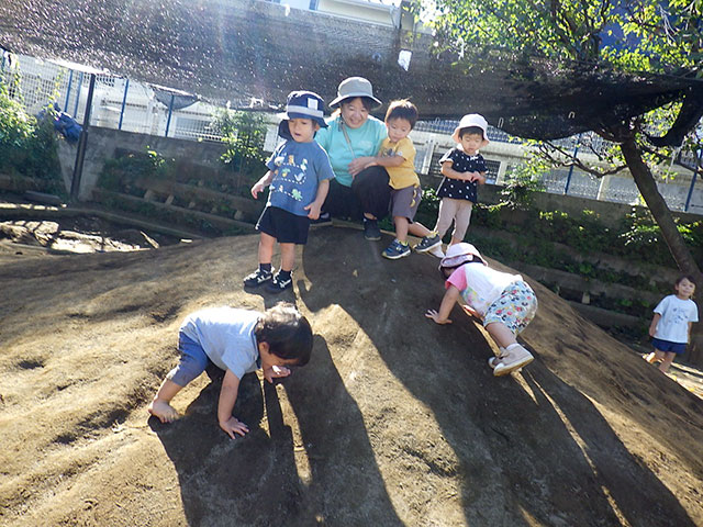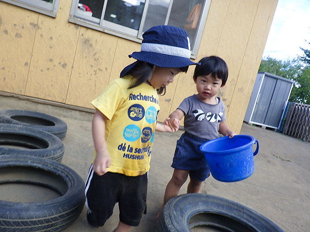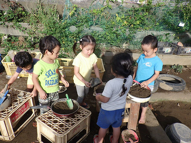 夏に大きなプールでいっぱい遊んだ幼児クラスの子ども達。 畑に秋の野菜を植えたり、異年齢でアートや散歩を楽しんでいます。くま組もきりん組も、気の合う仲間と数人で遊ぶ姿が多くなり、おしゃべりも盛んです。でも自分の思いと相手の思いがぶつかったとき、自分の気持ちをコントロールするのはまだまだ難しくケンカもたくさん起きています。そんな時、周りの友だちが助けてくれたり、大人が間に入り、解決方法を見つけていきます。こうやって経験を積み重ね、気持ちのコントロールが出来るようになって行くと思います。ぞう組が行ったお泊り保育。くま組もきりん組も「自分たちもいつかやりたい!」「ぞう組さんみたいになりたい!」と思いを膨らませています。ぞう組は20人の仲間とお泊り保育を成し遂げた自信が次への力になっているようです。どのクラスも、これからどんなことがあるか、楽しみです。