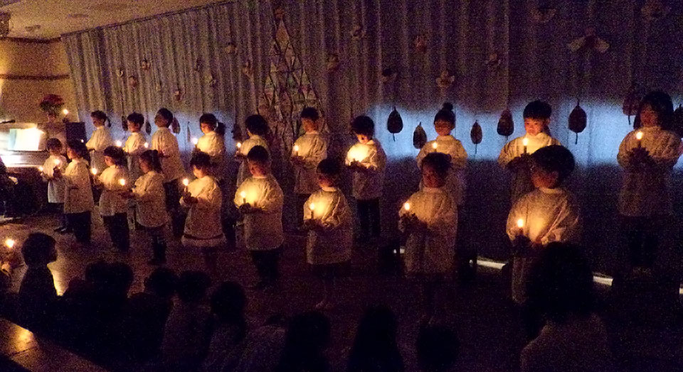 『クリスマスってなあに』 中澤先生の声に 耳を傾けます。 静かなホールにぞう組がキャンドルを持って登場。手に持つキャンドルは、ぞう組ひとりひとりが作ったキャンドル。どれも個性的な作品で素敵です。