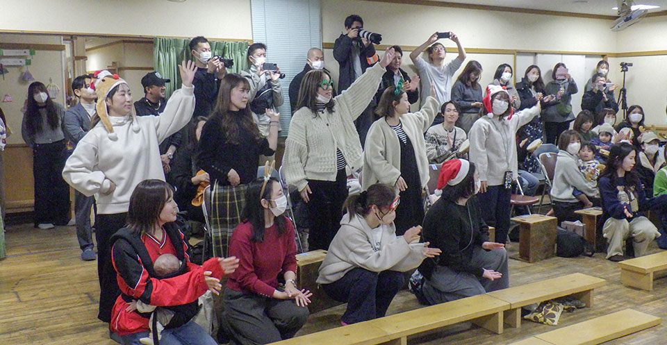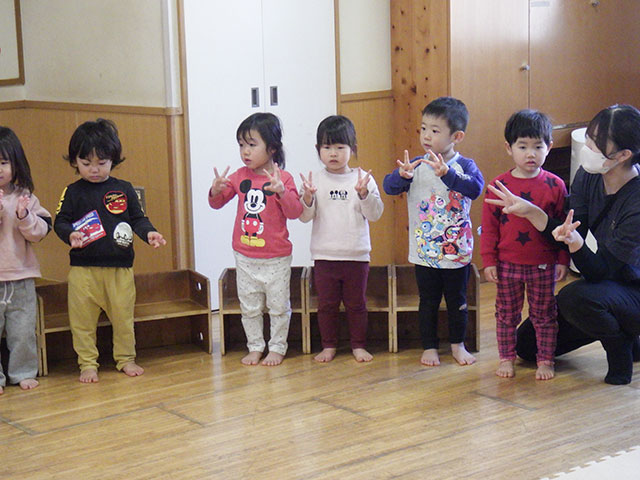 蜜蝋でできたろうそくに灯りがともるとホールの中が何ともいえない温かさに包まれ、ぞう組さんの歌声がホールの中に響きわたると、いつもとちょっぴり違う雰囲気に、元気いっぱいのきりん組もジーっと見いっていました。キャンドルの後はきりん組の手遊びと歌。自信満々に大きな声で歌う子もいれば、恥ずかしさのあまりうつむいてしまう子もいましたが、それも本来の姿。そのあとは、4つのグループに分かれて、わらべ歌やリズム、絵本を使ったごっこ遊び、ゲームなど日頃の遊びを楽しみました。お父さんお母さん方に優しく見守られながら、心地いい時間を過ごすことができました。お父さん、お母さんからのプレゼントの歌も、とても素敵でした。
