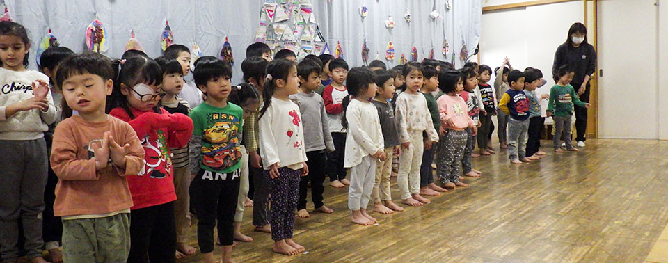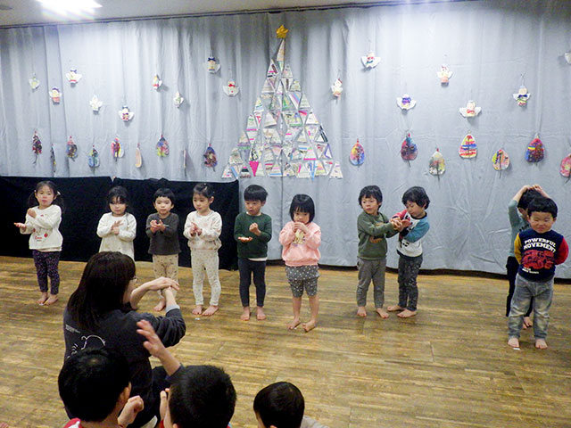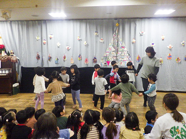 12月13日に4・5歳児、15日に3歳児クラス、17日に0・1・2歳児クラスのクリスマス会を行いました。クリスマスというと、きらびやかに街中は光り輝き、なんだか心がウキウキします。クリスマスっていったいどんな日なんだろう?クリスマス会の前にぞう組は前理事長の中澤先生から「クリスマスってなあに」という絵本をもとに話を聞きました。『クリスマスは神様の子どもが生まれた日。だから、みんなの幸せを願う日です。』そんな話しに子どもたちは耳を傾けていました。誰もがお互いを理解し、人々の幸せを願い、共に生きられる世界になったら、戦争も、悲しい事件も起きないはずです。尊い命が奪われることのない世界を願わずにはいられません。3回行った保育園でのクリスマス会。「おいしいね!」とご飯を頬張り、友だちと見つめって笑いあう、そんな子どもたちを見ながら、命がここにあり、大好きな人が隣にいてくれること。これこそが幸せ。そんな思いでいっぱいになりました。この幸せがずっとずっと続きますように…